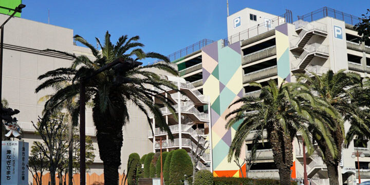 津市にある既存の駐車場外壁に意匠を施し、街の中心交差点を明るい雰囲気に変えました。